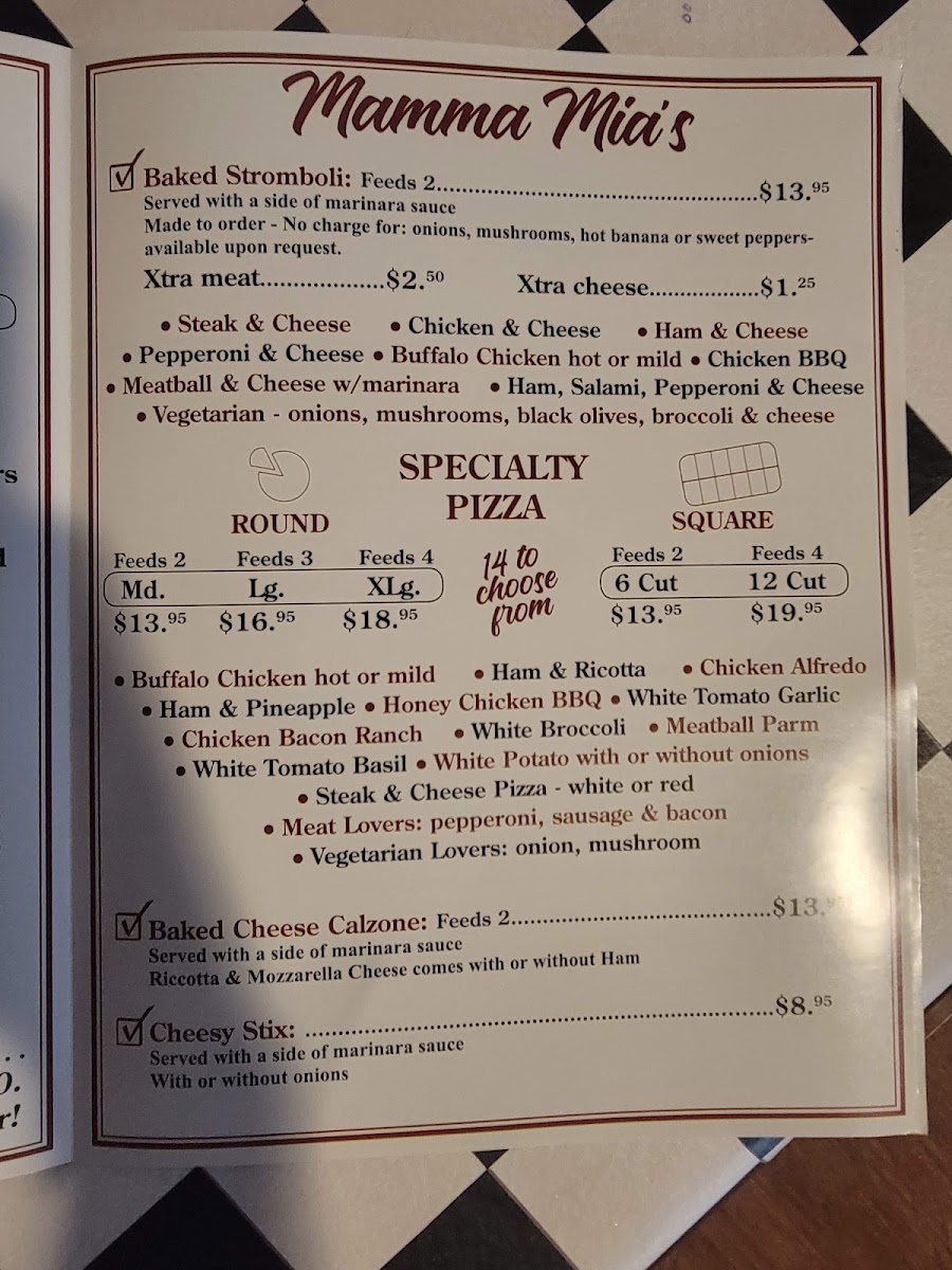 Mamma Mia’s Pizza offers a straightforward and comforting menu centered on classic, satisfying flavors. The selection includes a variety of pizza options, from the beloved Cheese Pizza to the distinctive Sicilian style, alongside hearty salads and baked stromboli filled with flavorful ingredients like chicken and ham. Complementing these are simple yet comforting sides such as garlic knots, French fries, and chicken tenders.